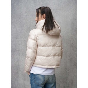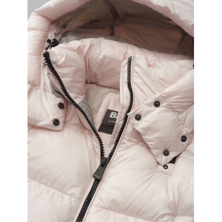 Giubbetto invernale in nylon micro rip idrorepellente con colletto alto removibile. Imbottitura sostenibile con impuntura a righe orizzontali con interno in contrasto colore per abbinare il giubbetto con eleganza e calore.