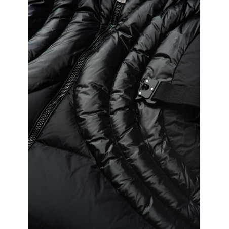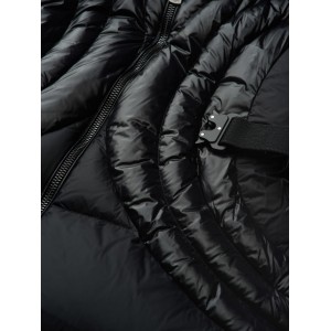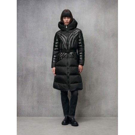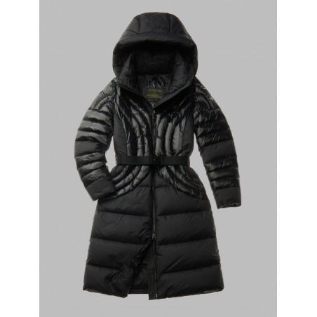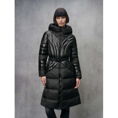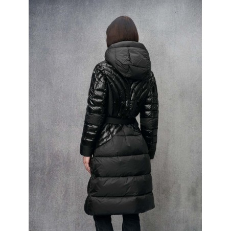 Piumino trapuntato a linee curve ed orizzontali con collo alto fisso. Capo svasato in stile urban, pratico e fashion, con cintura regolabile e motivo nylon lucido ed opaco di decoro. Piumino adatto a tutte le occasioni.