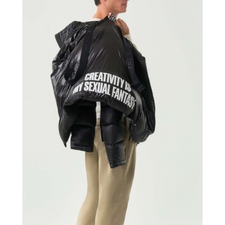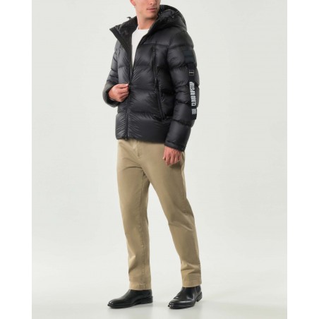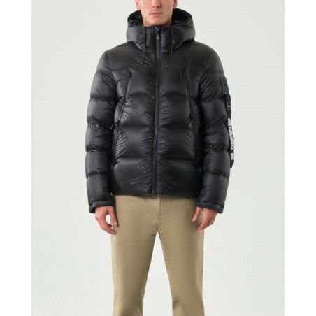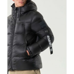 Piumino in nylon micro ripstop trapuntato e imbottito in 90% piumino e 10% piuma con cappuccio fisso regolato da coulisse. Ampie tasche con doppio cursore ai lati, chiusura principale con zip a doppio cursore, patch porta logo in gomma applicato sulla manica sinistra, pratiche bretelle all'interno.