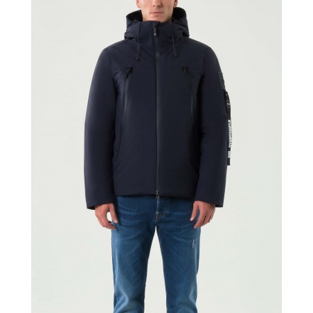 .Giubbino in nylon liscio opaco idrorepellente imbottito in 90% piumino e 10% piuma con cappuccio regolato da coulisse, chiusura zip a doppio cursore e ampie tasche con cerniera ai lati termonastrate. Patch porta logo in gomma applicato sulla manica sinistra, pratiche bretelle all'interno.