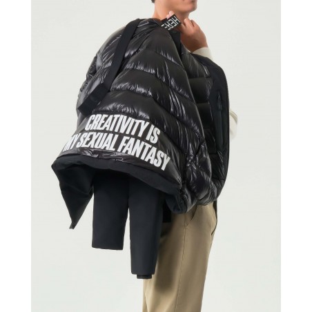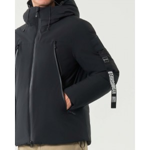 .Giubbino in nylon liscio opaco idrorepellente imbottito in 90% piumino e 10% piuma con cappuccio regolato da coulisse, chiusura zip a doppio cursore e ampie tasche con cerniera ai lati termonastrate. Patch porta logo in gomma applicato sulla manica sinistra, pratiche bretelle all'interno.