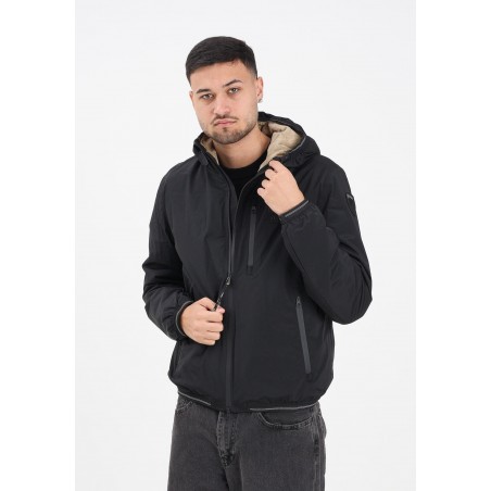 Chiusura centrale con zip doppio cursore nascosta da fettuccia a spina di pesce in tono, copri cursore sul collo e para zip interna.