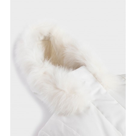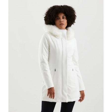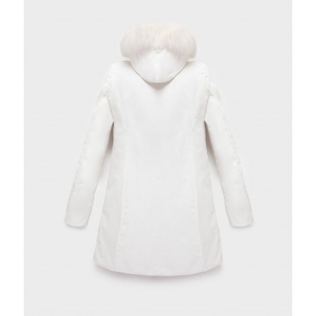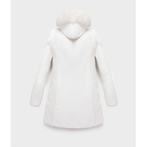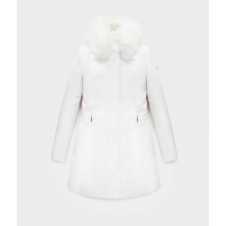 Piumino trapuntato a linee curve ed orizzontali con collo alto fisso. Capo svasato in stile urban, pratico e fashion, con cintura regolabile e motivo nylon lucido ed opaco di decoro. Piumino adatto a tutte le occasioni.