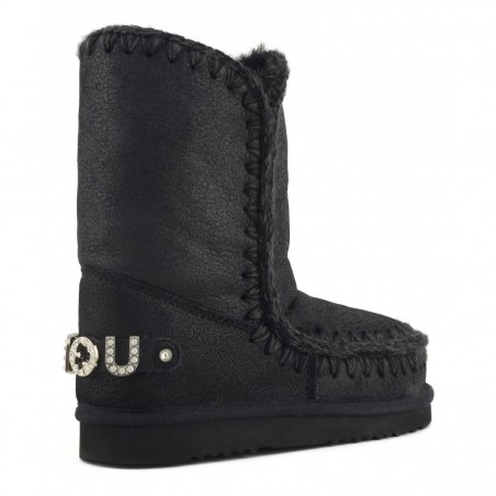 L'iconico Eskimo 24 con logo strass realizzato in vera pelle di montone double-face divinamente calda, cuciture in lana all'uncinetto distintive di Mou, tallone rinforzato e una suola esterna in Eva & gomma. Quetso eskimo alto 24 cm é elegante , comodo e resistente.